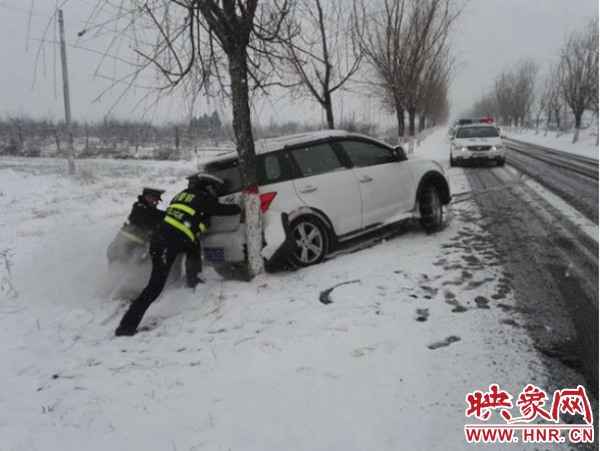 登封交警大隊從1月3日晚上開始,就組織警力百余人在路面上不間斷巡邏,救助拖移壞車9輛。