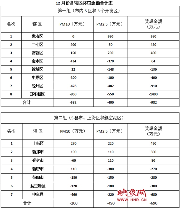 在對鄭州市環(huán)境空氣質(zhì)量進行的“考試”的基礎(chǔ)上,實行獎懲制度,有獎也有罰,客觀科學地對市區(qū)空氣質(zhì)量進行的監(jiān)督考察。對每周的空氣質(zhì)量排名獎懲以及獎懲金額進行公示,獎罰透明、看得見。本月累計2周排名倒數(shù)第一并對其進行全市通報批評的為鄭東新區(qū)、經(jīng)開區(qū)、中牟縣、新密市。