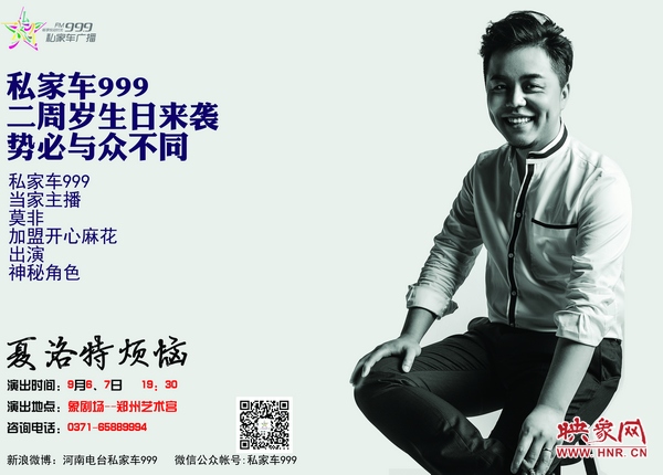 活動內(nèi)容:正值私家車999兩歲生日來臨之際,私家車999特邀開心麻花全國票房口碑雙料冠軍《夏洛特?zé)馈吩卩嵵菹髣鲩_演,私家車999主持人將擔(dān)綱劇中角色,9月6日、9月7日象劇場鄭州藝術(shù)宮,一起來過生日吧!
