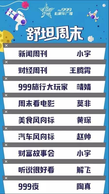 新聞周刊、財(cái)經(jīng)周刊、財(cái)富故事會(huì)、聽(tīng)說(shuō)很好看、美食風(fēng)向標(biāo)、汽車(chē)風(fēng)向標(biāo)……周末的生活,就得這么舒坦,就得這么輕松有料。短小趣味的節(jié)目,不同屬性的內(nèi)容,你要音樂(lè),還是資訊,我們這里全部都有。