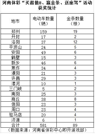 9月份開展“買超值8、贏金條、送座駕”即開型體育彩票促銷活動(dòng)早已圓滿收官,18地市彩民瓜分581輛“座駕”和89根金條!從獲獎(jiǎng)情況看,鄭州、安陽、新鄉(xiāng)的彩民中得“座駕”數(shù)量位居前三甲,從獲得金條數(shù)量看,鄭州、洛陽、商丘彩民的獎(jiǎng)品含金量則居前。各地市彩民的收獲情況如下: