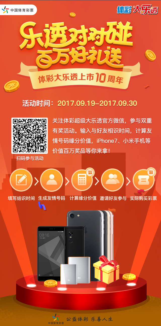 本次活動(dòng)于2017年9月19日至30日在體彩超級(jí)大樂(lè)透官方微信進(jìn)行?;顒?dòng)以體彩大樂(lè)透10周年為背景,以“友誼”為主題,采用線上、線下相結(jié)合的活動(dòng)方式,為彩友們提供了雙重好禮?;顒?dòng)期間,彩友們只要關(guān)注體彩超級(jí)大樂(lè)透官方微信,點(diǎn)擊底部“樂(lè)透有禮”菜單即可進(jìn)入活動(dòng)頁(yè)面,或掃描活動(dòng)二維碼直接進(jìn)入頁(yè)面參與。在活動(dòng)首頁(yè)點(diǎn)擊“碰碰運(yùn)氣”,輸入與好友的相識(shí)時(shí)間,根據(jù)相關(guān)信息生成一注緣分號(hào)碼?;顒?dòng)根據(jù)緣分號(hào)碼10年來(lái)歷史累計(jì)中獎(jiǎng)獎(jiǎng)金進(jìn)行排行,每日根據(jù)排行榜派發(fā)相應(yīng)獎(jiǎng)品。同時(shí),彩友們還可在每周一、三、六體彩大樂(lè)透開(kāi)獎(jiǎng)當(dāng)期,到線下體彩投注站購(gòu)買(mǎi)自己相應(yīng)的緣分號(hào)碼,并通過(guò)活動(dòng)平臺(tái)上傳該注號(hào)碼的彩票序列號(hào)贏取更多獎(jiǎng)品。