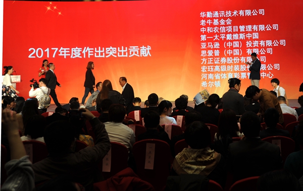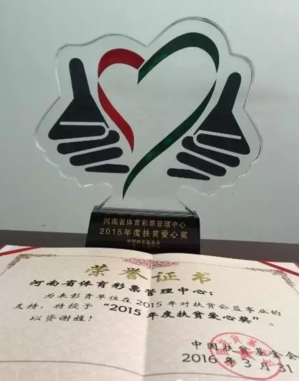 河南省體育彩票管理中心榮獲中國(guó)扶貧基金會(huì)“2017年度扶貧突出貢獻(xiàn)獎(jiǎng)”,中心黨支部書記王海新代表單位領(lǐng)取了獎(jiǎng)杯和證書。