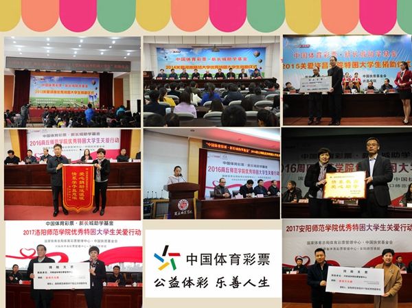 河南省體育彩票管理中心自2013年開始,已經(jīng)連續(xù)五年通過(guò)國(guó)家體育總局體育彩票管理中心與中國(guó)扶貧基金會(huì)合作,以“中國(guó)體育彩票·新長(zhǎng)城助學(xué)基金”形式,向信陽(yáng)師范學(xué)院、河南師范大學(xué)、許昌學(xué)院、商丘師范學(xué)院、周口師范學(xué)院、洛陽(yáng)師范學(xué)院、安陽(yáng)師范學(xué)院共計(jì)7所院校的400名優(yōu)秀貧困大學(xué)生累計(jì)捐助助學(xué)金200萬(wàn)元。2015年,河南體彩中心在前兩年每年捐助50名貧困大學(xué)生的基礎(chǔ)上,將受助名額增加到了60名,2016年開始又將捐贈(zèng)學(xué)校從一所增加到兩所,受助學(xué)生名額從60名又增加到120名,每個(gè)學(xué)生的受助金額從4000元提高到了5000元,希望幫助更多的困難學(xué)生及其家庭減輕經(jīng)濟(jì)負(fù)擔(dān)和精神壓力。