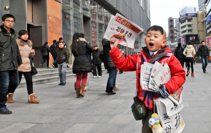 元旦小長假第二天,寒風(fēng)凜冽,氣溫降到-5℃。南京新街口地鐵口川流不息的人流中,一個(gè)身穿紅色外套,背著青奧吉祥物“砳砳”的小男孩格外引人注目。他背著一只碩大口袋,報(bào)袋上印有“賣一份報(bào)紙捐一毛錢”字樣,一邊走一邊叫,“賣報(bào),賣報(bào)——”他就是去年大年夜一祼成名的裸跑弟多多,這是他的鷹爸在對(duì)他進(jìn)行財(cái)商訓(xùn)練。據(jù)悉,這是鷹式教育“十商并舉”中的重要一環(huán)。