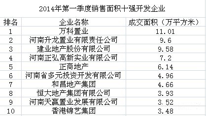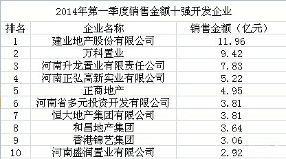 建業(yè)地產(chǎn)股份有限公司以11.96億元的銷售金額高居榜首,成為2013年一季度商品住宅企業(yè)銷售金額冠軍。萬科置業(yè)、河南升龍置業(yè)以9.42億元和7.83億元緊隨其后,分列亞軍和季軍。第四至第十名為河南正弘高新實業(yè)有限公司(5.22億元)、正商地產(chǎn)(4.95億元)、河南省多元投資開發(fā)有限公司(3.81億元)、恒大地產(chǎn)集團有限公司(3.81億元)、和昌地產(chǎn)集團(3.64億元)、香港錦藝集團(3.06億元)、河南盛潤置業(yè)有限公司(2.92億元)。