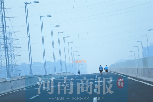 前天晚上7時30分,鄭州市南三環(huán)與京廣路交叉口向南500米路西,幾名市民沿著高架橋匝道向二層走去。高架橋二層橋面西側,人們?nèi)宄扇海笕藗冞呑哌吜奶?,小孩兒則在車道上嬉笑玩耍。東側,一名女士大步快速地向北走,“不刮風不下雨,沒事兒就來這鍛煉。”此外,還有30多名市民正在跳廣場舞。