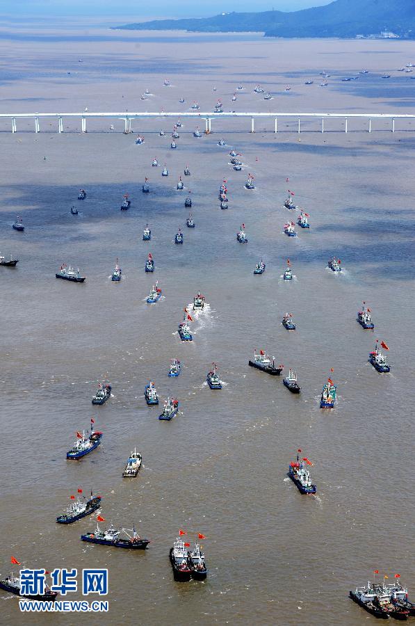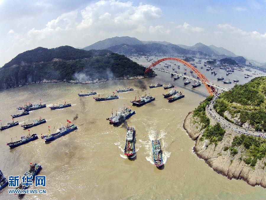 9月16日,浙江省舟山市沈家門漁港的漁船出港經過朱家尖大橋開赴漁場。當日,為期3個半月的東海伏季休漁結束,眾多漁船劈波斬浪,開往漁場。 新華社發(fā)(華志波 攝)