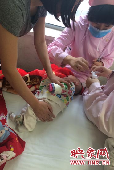 由于持續(xù)高燒,護(hù)士正在對大寶抽血化驗(yàn)。