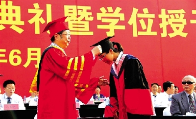 鄭州大學(xué)校長(zhǎng)劉炯天在畢業(yè)典禮上為學(xué)子撥穗
