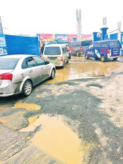 鄭州農(nóng)業(yè)路與沙口路附近的保通路上,交叉口東西兩側各有一處較大的深坑。西側一處深約20厘米,不少電動車主行至坑邊,不敢涉水通過,只能擠進快車道行駛,非常危險;東側一處大坑面積約60平方米,水坑最深處可達30厘米,私家車從此經(jīng)過,濺起一片水花。該大坑正處一個丁字路口正中央,且沙口路、農(nóng)業(yè)路的車輛僅有此處一條通道,因車輛通行緩慢,路面私家車排起一條長龍。