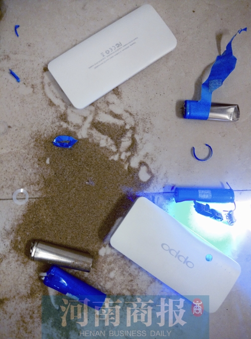 離開后,河南商報記者將充電寶拆開,看到充電寶中部分蓄電池與其他電池獨立分開,根本沒有導(dǎo)線,而沒有導(dǎo)線的電池里,裝滿了沙子?!皁ppo”充電寶中共有5節(jié)電池,有2節(jié)與電板通過導(dǎo)線相連,剩下光禿禿的3節(jié)電池“自成一派”。用錘子敲碎2節(jié),從電池里流出了細(xì)沙。