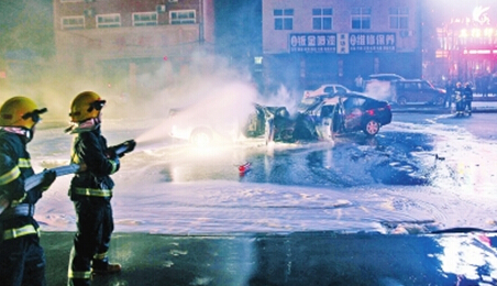 到現(xiàn)場后,消防員發(fā)現(xiàn)一輛出租汽車與一輛黑色汽車迎面相撞。車頭變形嚴(yán)重,兩輛車上的火焰躥出2米多高。根據(jù)現(xiàn)場情況,指揮員立即下令,采用泡沫滅火的方式進(jìn)行撲救,迅速控制住火勢。根據(jù)經(jīng)驗,繁昌路中隊指導(dǎo)員劉濤和前進(jìn)路中隊指導(dǎo)員莫潁超經(jīng)過現(xiàn)場研判,認(rèn)為出租車一般都攜帶有天然氣罐,如果處置不當(dāng),氣罐發(fā)生爆炸將對參與救援的消防、公安、急救等部門和圍觀群眾造成不可估量的傷害。
