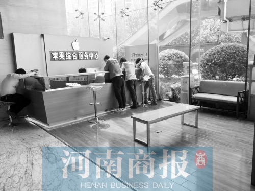 昨天上午,河南商報記者來到了升龍大廈一樓。該手機維修點有多處“蘋果”的標志,柜臺里也全是蘋果手機以及相關配套產(chǎn)品,有兩個消費者在維修蘋果手機。