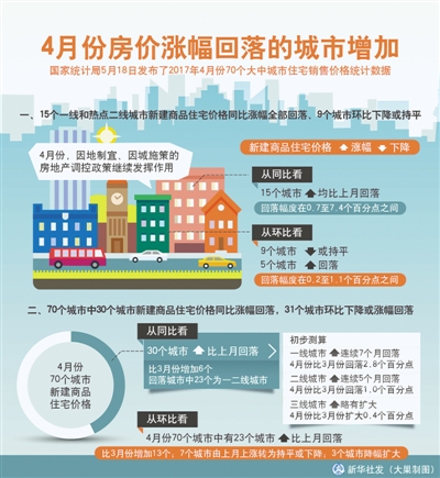 國(guó)家統(tǒng)計(jì)局城市司高級(jí)統(tǒng)計(jì)師劉建偉解讀稱(chēng),從環(huán)比看,4月份70個(gè)城市中有23個(gè)城市新建商品住宅價(jià)格漲幅比上月回落,比3月份增加13個(gè);7個(gè)城市由上月上漲轉(zhuǎn)為持平或下降;3個(gè)城市房?jī)r(jià)降幅擴(kuò)大。