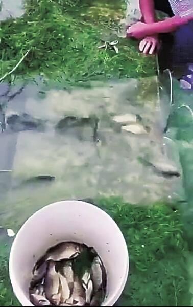 本次強降雨還導(dǎo)致固始縣境內(nèi)的多條河流水位暴漲,河邊地勢較低的農(nóng)田被淹沒。在固始縣城郊,一口水塘因為水位暴漲,水從塘埂一處低洼處溢出,水塘內(nèi)大量鯽魚紛紛隨著水流準(zhǔn)備出逃。村民發(fā)現(xiàn)后,在水流下方用網(wǎng)攔住魚兒去路,不一會兒就收獲一水桶鯽魚。