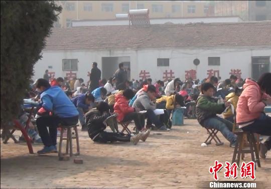 緊鄰臺(tái)前縣政府1公里之遙的城鎮(zhèn)中學(xué),由于教室不充裕,學(xué)生在室外空地上考試?!《w 攝