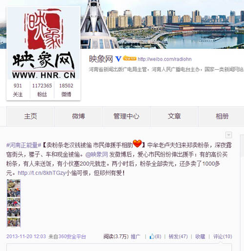 《老漢錢被盜,鄭州市民網(wǎng)友義買粉條》微博發(fā)布于2013年11月19日,當(dāng)天,映象網(wǎng)記者在街頭采訪,偶遇中牟縣的一位農(nóng)家老漢與老伴到鄭州賣粉條,不料騾子被偷,錢也被盜。映象網(wǎng)迅速發(fā)布新聞,并連續(xù)發(fā)布多條微博,呼吁市民網(wǎng)友伸出援手幫助兩位老人,迅速引發(fā)關(guān)注,短時(shí)間內(nèi)轉(zhuǎn)發(fā)量超過200次,閱讀量接近20萬次,引發(fā)眾多愛心市民網(wǎng)友前往購買粉條,400多斤粉條在兩個小時(shí)內(nèi)被搶購一空,丟失的騾子也成功找回。