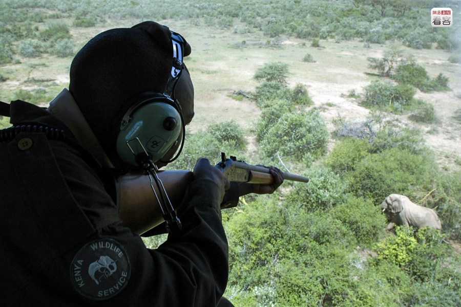 為了打擊武裝盜獵分子,非洲一些國家組建了特種部隊,以加強國家公園的護衛(wèi)工作,但難以阻擋偷獵者的殺戮。圖為2008年3月18日,肯尼亞內(nèi)羅畢,一名肯尼亞野生動物保護局官員向一頭大象發(fā)射鎮(zhèn)靜劑標(biāo),以裝載GPS跟蹤器,監(jiān)管其活動范圍和運動模式,幫助防止偷獵者靠近。REUTERS