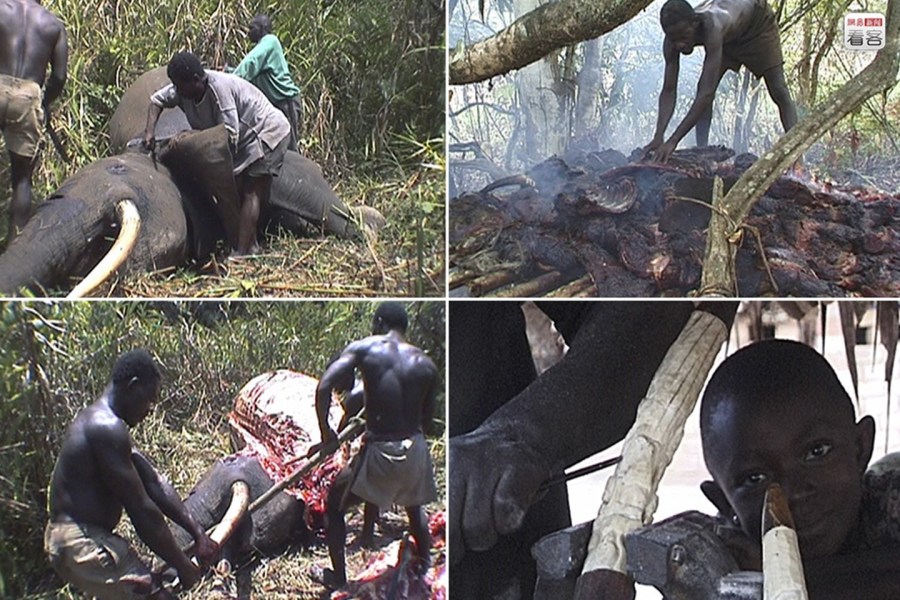 組圖為當(dāng)?shù)貢r間2007年5月3日,一名野生動物攝影師偷拍到非洲偷獵者獵殺大象象牙和肉的畫面。圖左上為偷獵者在槍擊完大象之后使用割刀割下大象的肉;左下為偷獵者使用棍子準備獲取象牙;右上為偷獵者熏烤割下的大象肉;右下為偷獵者展現(xiàn)獲得象牙。AP Photo/Courtesy Karl Amman