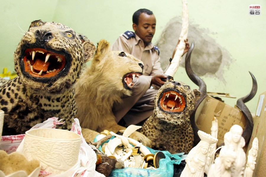 非法象牙經(jīng)銷商將象牙藏在普通集裝箱甚至是行李夾層,經(jīng)非洲各國黑市輾轉(zhuǎn),最終流向亞洲和歐洲。當(dāng)?shù)貢r間2005年4月14日,埃塞爾比亞亞地斯亞巴貝,埃塞俄比亞警察在警局倉庫檢查一批走私野生動物制品,包括約500公斤的非法象牙和動物標(biāo)本。AP Photo/Boris Heger