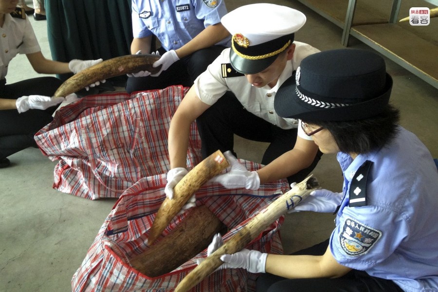 2013年6月19日,廣東東莞,黃埔海關(guān)監(jiān)管倉庫內(nèi),警察在清點一走私團伙裝在蛇皮袋里的走私象牙。該團伙首先在非洲購買象牙,然后以海運方式將走私象牙夾藏在紅豆、廢塑料等貨物中,瞞報進口至香港,并伺機用摩托艇分批從香港海上偷運走私至內(nèi)地銷售,構(gòu)成“非洲購貨—香港中轉(zhuǎn)—偷運闖關(guān)—國內(nèi)販賣”的完整走私鏈條。CFP