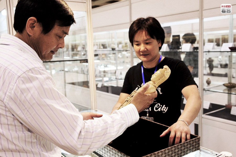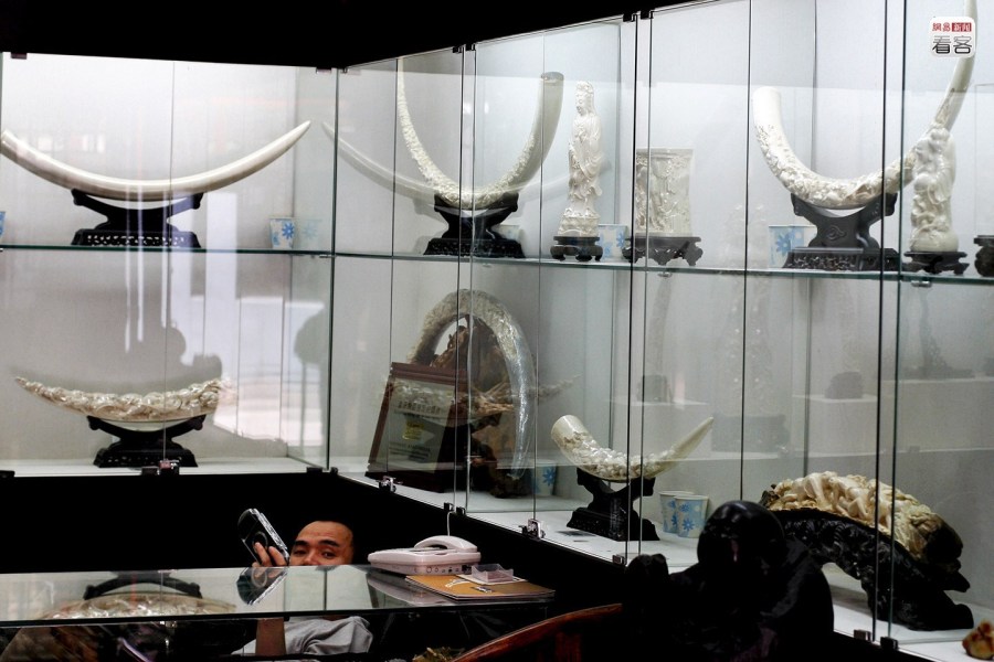 中國對象牙市場采用收藏證和特許經(jīng)銷制度,象牙制品一對一配有國家林業(yè)局頒發(fā)的收藏證。但中國一半以上的合法象牙加工銷售企業(yè)牽涉非法貿(mào)易,將走私象牙“洗白”。圖為2010年6月30日,杭州,一名收藏愛好者在西泠春拍預(yù)展上查看一件象牙工藝品。CFP