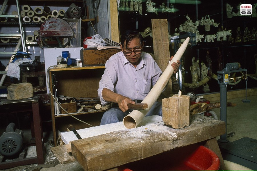 在合法原料中摻入非法原料,走私象牙就被“洗白”,這成為行業(yè)內(nèi)一個公開的秘密。一個合法收藏證,可以成為眾多非法象牙制品的“護身符”。圖為1989年7月,香港,一名象牙雕刻師在工廠工作。Photo by Tom Stoddart/Getty Images