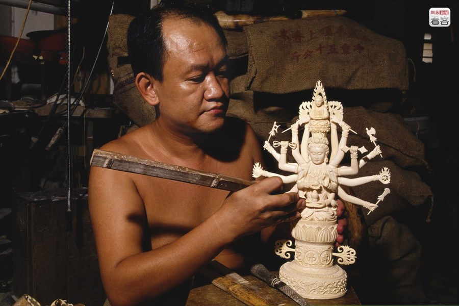 與國際呼聲背道而馳的是中國收藏家對象牙雕刻作品的狂熱。象牙作為一種雕刻的原料,再加上精細的雕工,所制成的工藝品往往成為收藏家們爭相收藏的對象。圖為當(dāng)?shù)貢r間2010年7月14日,香港,一名象牙雕刻師展示他的猛犸象牙雕刻作品。AFP PHOTO/MIKE CLARKE