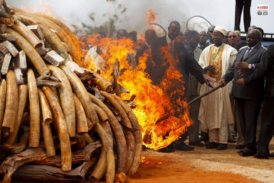2013年11月,非洲野生動物基金會發(fā)布一項聲明,號召各國銷毀庫存象牙并禁止一切國內(nèi)象牙貿(mào)易,稱打擊非法象牙唯一有效的方法是消除市場需求。圖為2011年7月20日,肯尼亞,在察沃國家公園,肯尼亞總統(tǒng)吉巴和隨行人員一起將一堆非法獵取的象牙點燃,以示對違法狩獵和非法象牙貿(mào)易的打擊決心。CFP