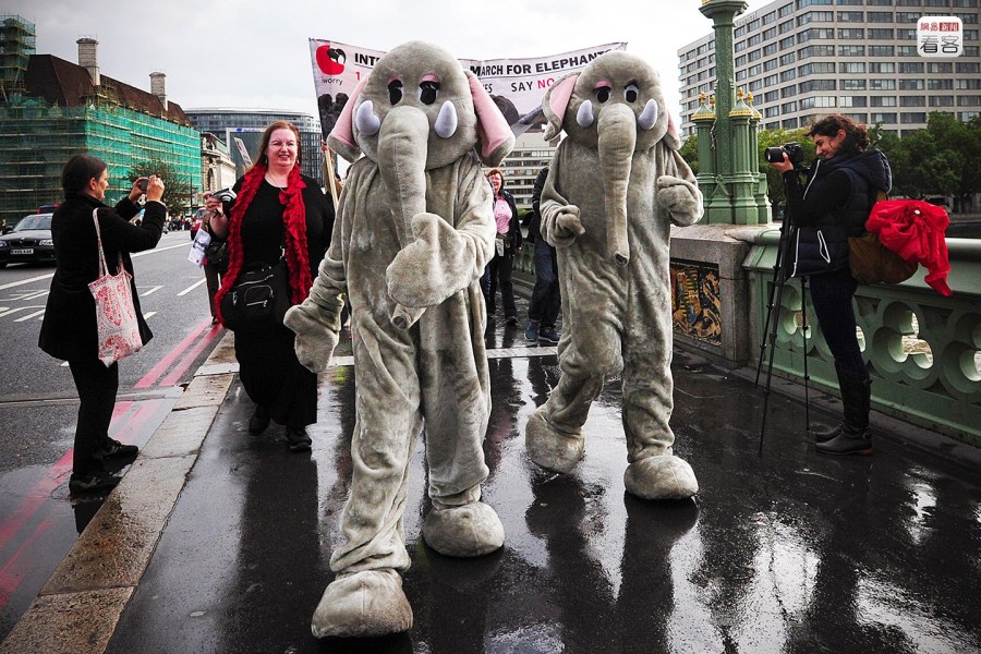 圖為當(dāng)?shù)貢r間2013年12月4日,英國倫敦,示威者身穿大象服參加游行,抗議全球的象牙貿(mào)易。AFP PHOTO/CARL COURT