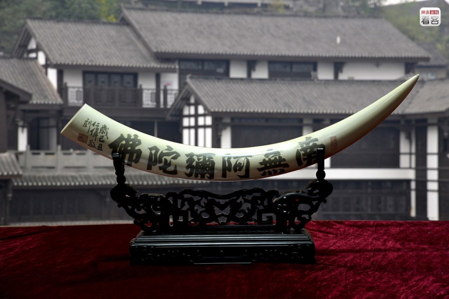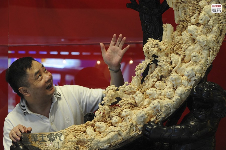 不斷上升的需求驅(qū)動象牙價格的上漲,反過來增加了象牙作為資產(chǎn)以保值收藏的吸引力,使象牙的灰色市場不斷運轉(zhuǎn)。圖為2012年4月6日,重慶,第五屆中國工藝品、禮品及家居飾品博覽會上,一件長1.1米刻有《金剛經(jīng)》等80部經(jīng)文的象牙微雕作品被估價千萬元以上。CFP