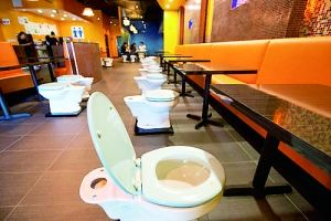 在這家名為“神奇衛(wèi)生間”的餐廳里,顧客們坐在馬桶蓋上吃飯,餐具也是馬桶形狀。不少顧客慕名而來,由于就餐人數(shù)多,有些人不得不在門口等位。