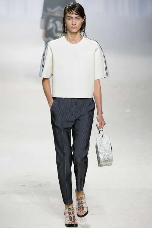 新一季,混搭主打清爽牌,針織拼接的廓型感套頭衫,配搭西裝款長褲,Boyish風(fēng)呼之欲出。流彩寶石裝飾的涼鞋,悄然流露女人細(xì)節(jié)。