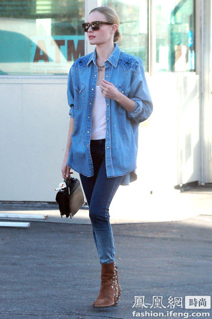 這一套造型讓牛仔成為主導(dǎo),Oversize的男孩式牛仔襯衫外套最能凸顯帥氣的Boy風(fēng)格,而和牛仔藍(lán)色最百搭的棕色系點綴其中,瘦腿的牛仔褲和上身形成強烈視覺對比,哪怕是披發(fā),也照樣酷勁十足!