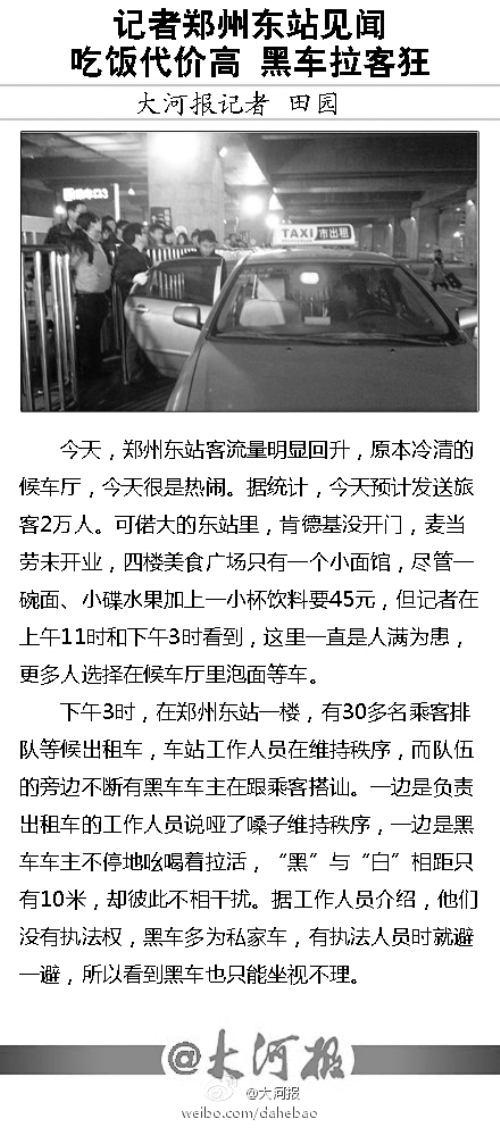 昨天,鄭州東站迎來一次客流小高峰,當(dāng)天,共發(fā)送旅客將近2萬人次。記者來到鄭州東站體驗(yàn)發(fā)現(xiàn),平素空曠無人的西廣場,出現(xiàn)了很多乘客的身影,三樓候車室也很熱鬧。但與熱鬧場景不相配的是,鄭州東站很多細(xì)節(jié)還未顧及到,吃飯代價高,“黑出租”與“白出租”公然搶生意。