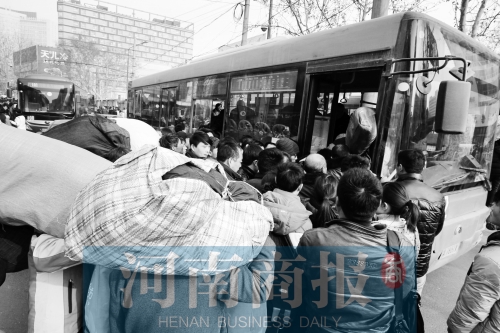 河南商報記者 鄧萬里/攝 不少返城農(nóng)民工下了長途車來擠公交車