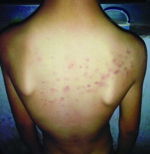 10月8日,謝女士在給小韋洗澡時(shí),發(fā)現(xiàn)孩子的后背上都是紅斑,像是被什么硬東西戳傷的。從謝女士提供的照片可以看到,小韋的后背上是成片的紅斑,記者粗略地?cái)?shù)了一下,紅斑超過50個(gè)?!爱?dāng)時(shí)我問他是怎么搞的,孩子也不說,我以為是在學(xué)校玩摔倒弄的,就沒再追問?!?/p>