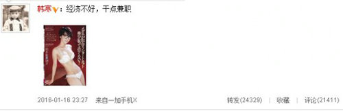 1月16日晚,韓寒在微博曬出一張與自己撞臉的女優(yōu)的照片,并寫道:“經(jīng)濟不好,干點兼職??吹秸掌缶W(wǎng)友紛紛留言調(diào)侃,“帥,不解釋”、“你把岳父甩開幾條街”、“岳父的發(fā)卡好好看”、“岳父從硬漢到軟妹的蛻變”。