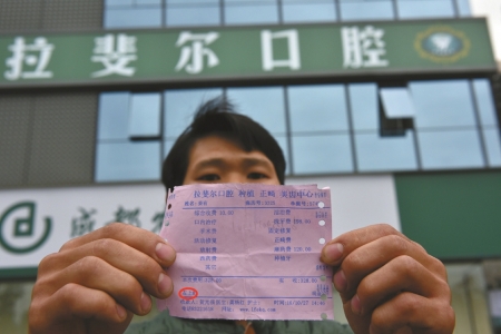 26歲的小姜在成都工作,住在姐姐家。一顆緊靠盡頭牙的左下牙把小姜折磨了近一年,平日他只是弄點(diǎn)含片“對(duì)付對(duì)付”。10月27日,小姜終于決定“來(lái)個(gè)徹底根治”。當(dāng)天下午1點(diǎn)過(guò),他問(wèn)姐姐要了300塊錢(qián)后,來(lái)到位于高新區(qū)府城大道的拉斐爾口腔醫(yī)院。