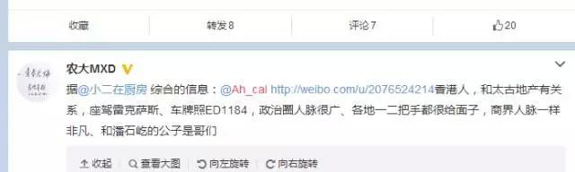 紅星新聞?dòng)浾甙l(fā)現(xiàn),有網(wǎng)友爆料稱,@ah-cal是香港人,和太古地產(chǎn)有關(guān)系,座駕雷克薩斯,車牌照ED1184。和潘石屹的公子有交集。不過,座駕、車牌照、和潘石屹公子有交集的證據(jù)似乎都來自@ah-cal以前微博的截屏,真?zhèn)尾恢?/p>