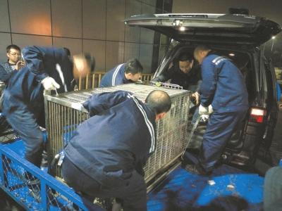 經(jīng)過近一個半小時的空中旅行,剛下飛機(jī)的“蜀蘭”還有一點(diǎn)驚慌。面對機(jī)場運(yùn)輸工作人員,她有些焦慮地在籠子里轉(zhuǎn)來轉(zhuǎn)去,變換姿勢。