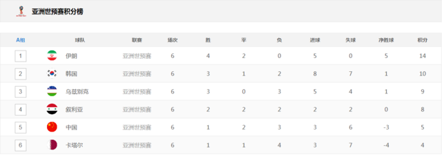 5.國(guó)足的凈勝球壓過(guò)敘利亞、烏茲別克斯坦。