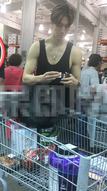 前天錦榮頂著中分發(fā)型、穿黑色背心、運動褲,露出結(jié)實胸膛與臂膀,打扮隨興,身旁沒有女伴。身高189公分的他鶴立雞群,一人推著購物車四處閑逛,在賣場約待了半小時,最后他買了烤雞跟日用品。
