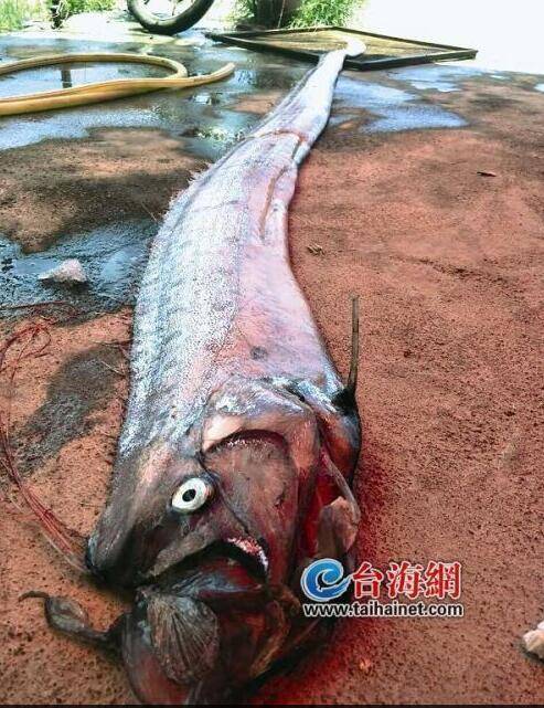 林先生將其拉上岸,他說(shuō),這怪魚(yú)看起來(lái)像帶魚(yú),好像剛死,頭部看起來(lái)很?chē)樔恕kS后,他把它撿回村里,村民從未見(jiàn)過(guò)這種魚(yú),林先生想把它賣(mài)掉,結(jié)果沒(méi)人敢買(mǎi)。