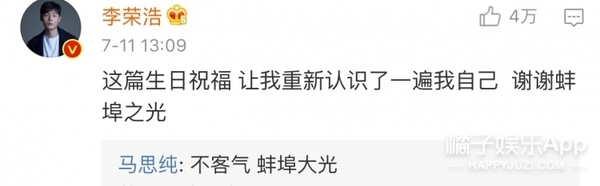 隨后李榮浩就在底下評論說馬思純的這篇生日祝福讓他重新認識了自己,還稱她為“蚌埠之光”。而馬思純也回復(fù)他說“不客氣,蚌埠大光?!?/p>