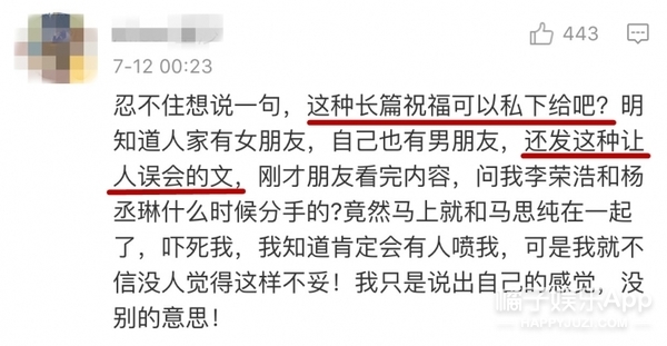 然而,評論的畫風(fēng)走向有點讓人意外。不少網(wǎng)友認為馬思純有歐豪了,李榮浩也有楊丞琳了,這種長文祝福信不應(yīng)該公開發(fā)↓