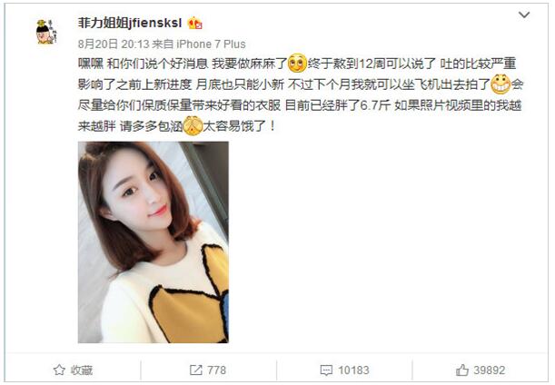 8月20,雪莉在小號微博@“菲力姐姐jfiensksl ”公布懷孕:“嘿嘿,和你們說個好消息,我要做媽媽了,終于熬到12周可以說了,吐的比較嚴(yán)重,影響了之前上新進(jìn)度,月底也只能小新,不過下個月我就可以坐飛機(jī)出去拍了。會盡量給你們保質(zhì)保量帶來好看的衣服,目前已經(jīng)胖了6.7斤,如果照片視頻里的我越來越胖,請多多包涵,太容易餓了! ”