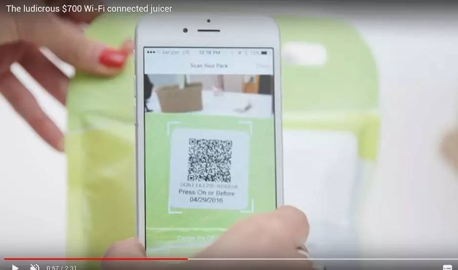 此外,這些主打互聯(lián)網(wǎng)概念的“果汁材料包”還有二維碼可供掃描。用戶掃碼之后,手機上可顯示出材料包內(nèi)商品的生產(chǎn)信息。并且聯(lián)網(wǎng)后的智能榨汁機還可以讀取這些信息。如果有變質、過期的不新鮮材料包被投入機器,榨汁機將拒絕工作。