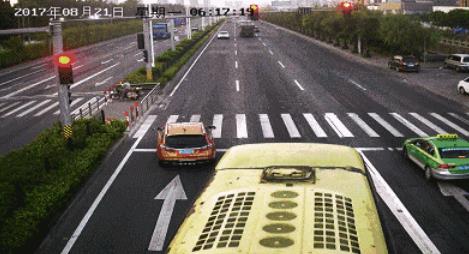 在后視鏡中,楊女士突然看到后面一臺大巴車疑剎不住車,車速甚快,朝前方急行而來,驚慌失措的楊女士出于本能,立即猛踩油門沖紅燈朝左前方?jīng)_了出去。